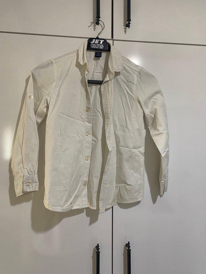 Beyaz pamuklu erkek çocuk gömleği, çıtçıtlı uzun kollu ve notlu yaka detayına sahiptir. Regular fit ve sade tasarımıyla günlük kullanıma uygundur.