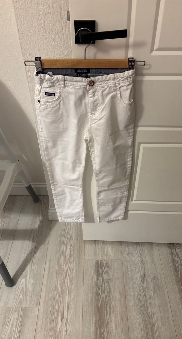 Erkek çocuklar için beyaz pamuk pantolon, regular fit kesim ve düğmeli kapanışlı, deseniz ve sokak stili görünümde.