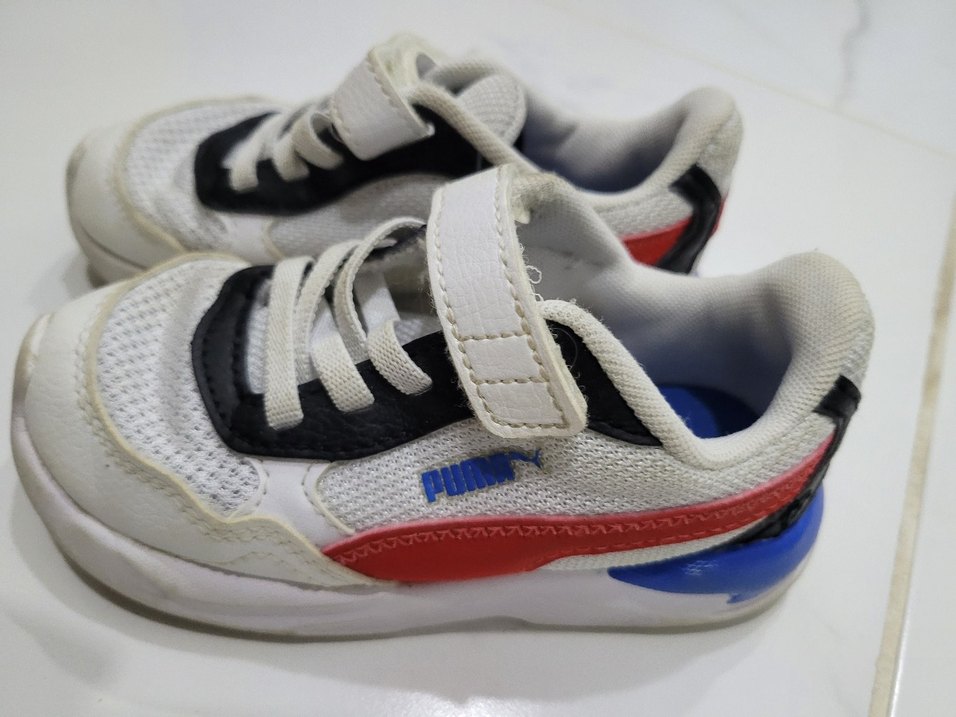 Erkek çocuklar için beyaz tabanlı, renkli desenli, cırt cırtlı Puma spor ayakkabısı. Kauçuk tabanlı, rahat ve dayanıklı tasarım.