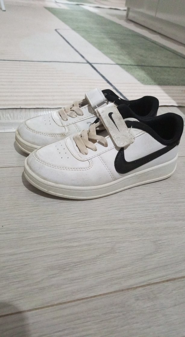 Beyaz erkek çocuk spor ayakkabısı, velcro ve bağcık detaylı, kauçuk tabanlı, sade tasarımlı günlük sokak stili için uygun. sadece sol cırt cırtı tutmuyor. başka hiçbir sorunu yok. orjinal değil ❌
