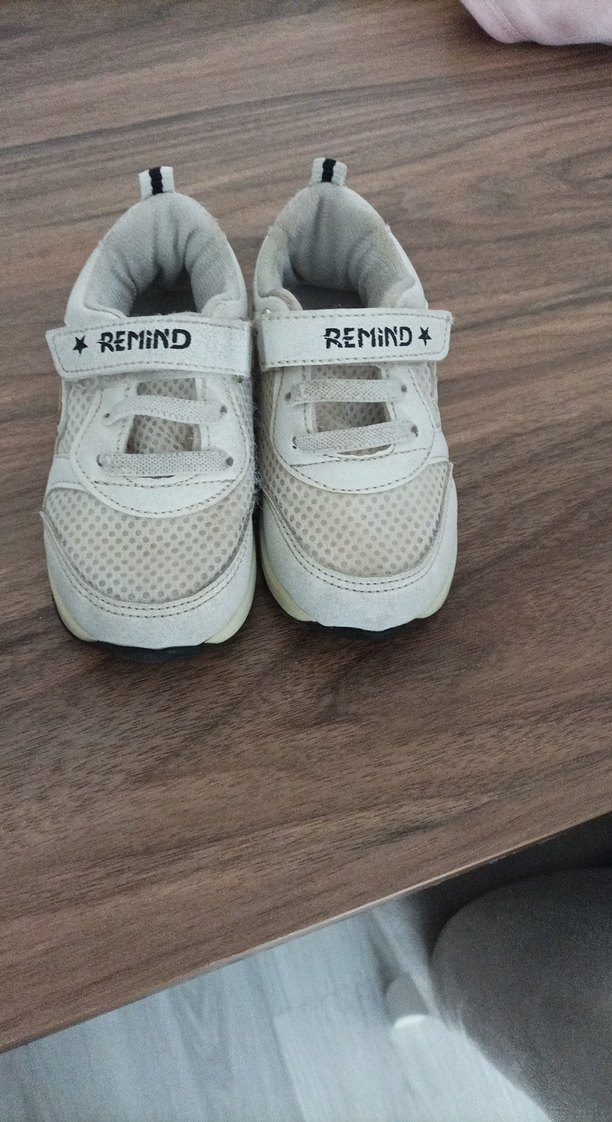 Gri baskılı detaylı beyaz erkek çocuk spor ayakkabı, velcro kapamalı ve kauçuk tabanlıdır. "REMIND" yazılı bantları vardır.