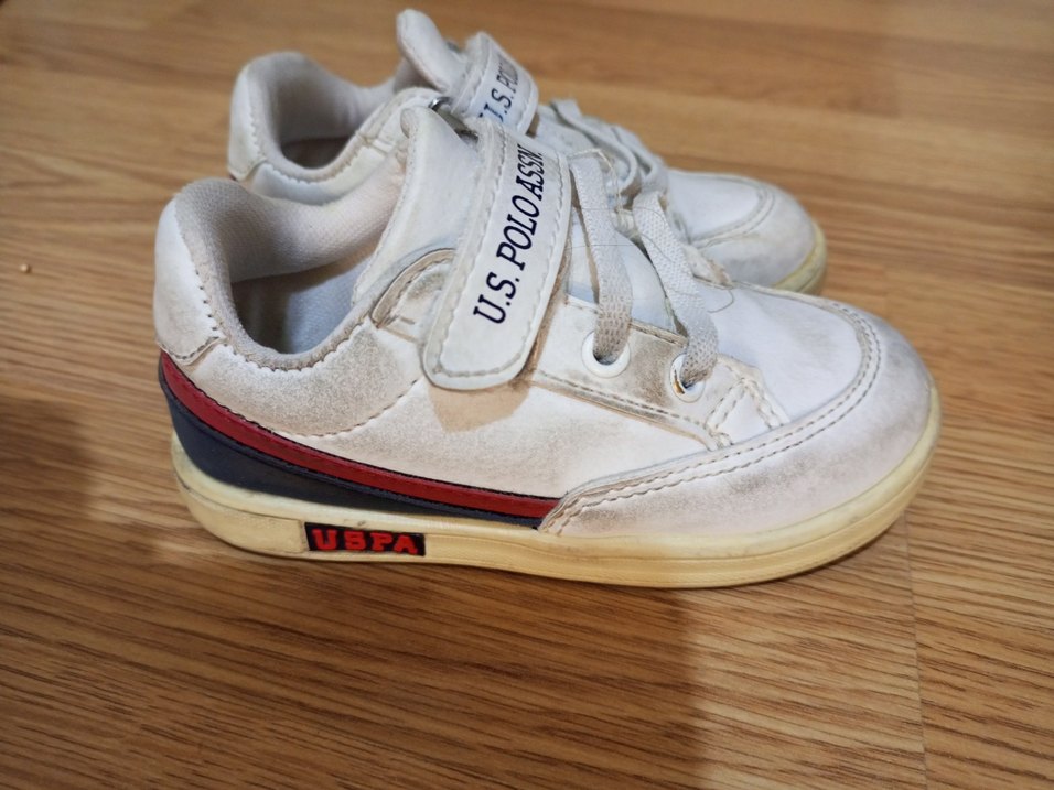 Beyaz renkli, renkli baskılı detaylara sahip, kolay giyilen velcro bantlı erkek çocuk spor ayakkabısı. U.S. Polo Assn. markalı.