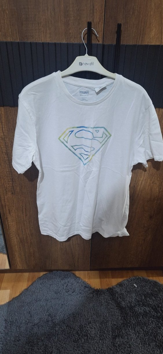 Pamuk kumaştan yapılmış, önünde Superman baskısı bulunan beyaz erkek çocuk tişörtü. Rahat kesim, kısa kollu ve yuvarlak yakalıdır.