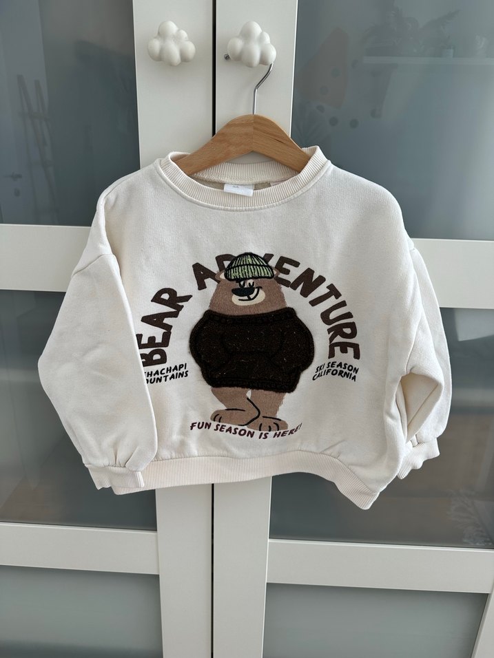 Erkek çocuklar için yuvarlak yakalı, uzun kollu ve bol kesim beyaz sweatshirt. Yumuşak ve sıcak kumaştan, baskılı ayı figürü ve örme detaylar içerir.