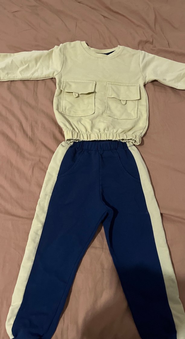 Kız çocukları için beyaz, uzun kollu, cep detaylı sweatshirt ile yanları beyaz şeritli lacivert eşofman altından oluşan bol kesim takım. Yumuşak ve rahat kumaşla günlük şıklık sağlar.