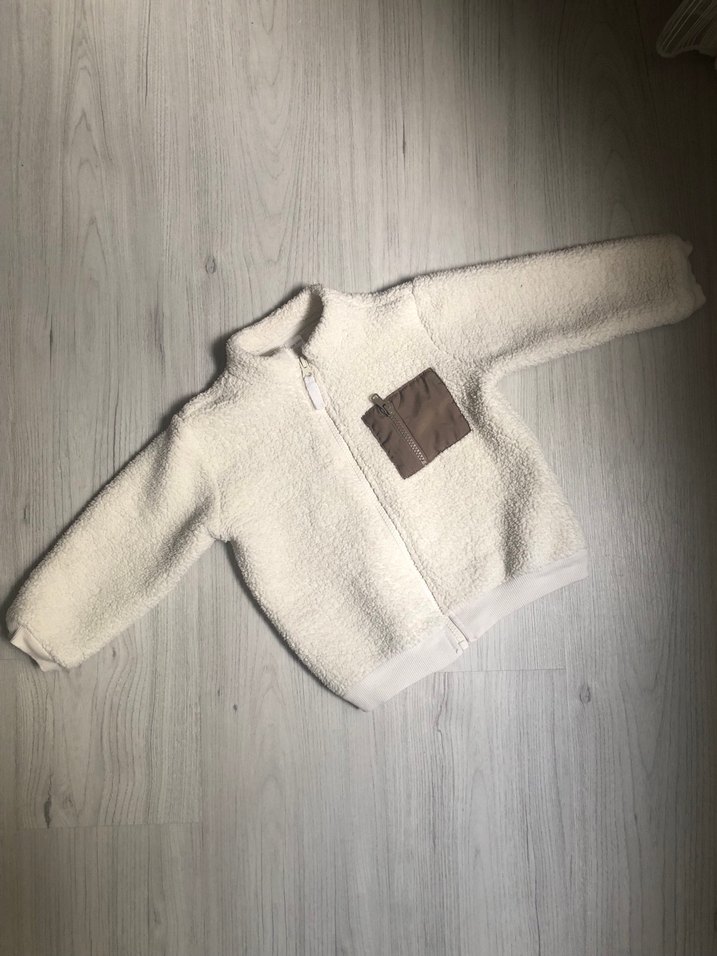 Erkek çocuklar için uzun kollu, bol kesim ve yuvarlak yakalı, yumuşak ve sıcak kumaştan yapılmış beyaz tüylü fermuarlı ceket . Ürün temiz defosuz sağlam.