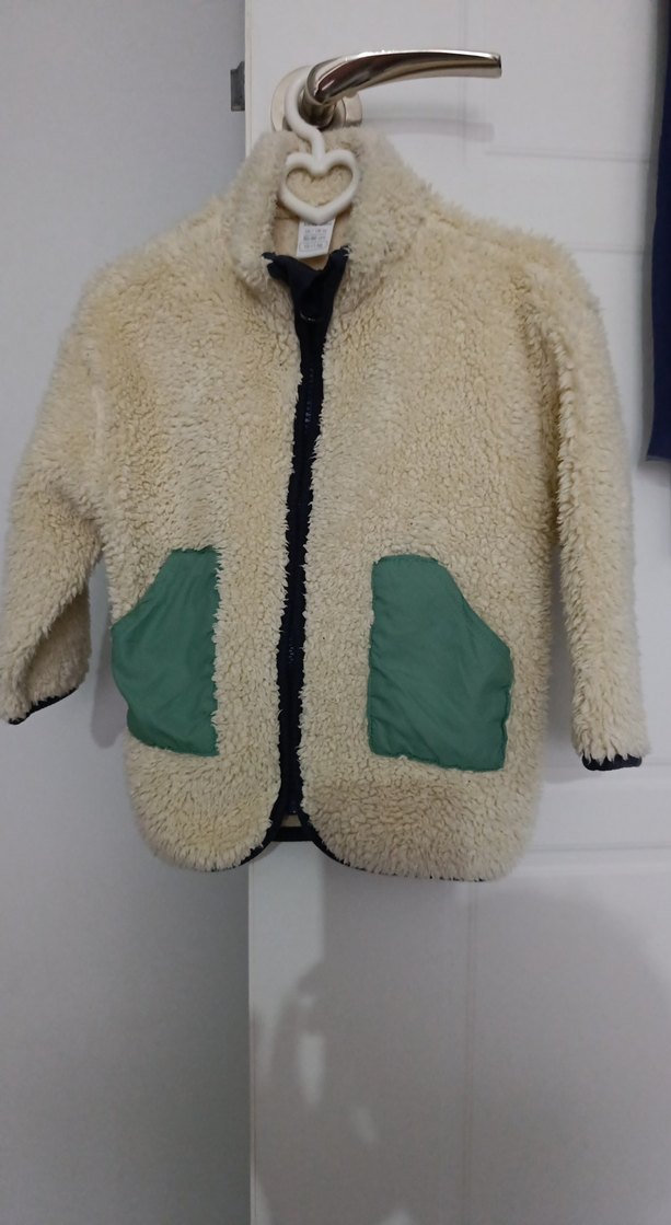 Tüylü dokulu, yeşil cepli polar. Yuvarlak yaka ve sokak giyimi tarzında, açık beyaz renktedir. hiçbir defosu lekesi yoktur