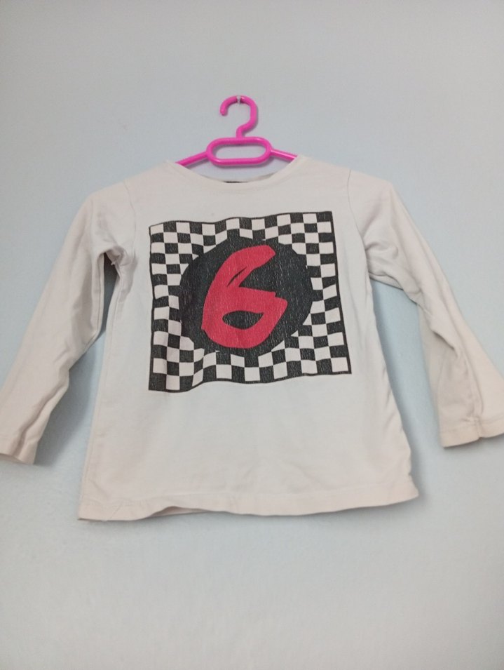 erkek çocukları için uzun kollu, yuvarlak yakalı, bol kesim tişört. Önünde kareli baskı ve kırmızı 6 rakamı bulunur