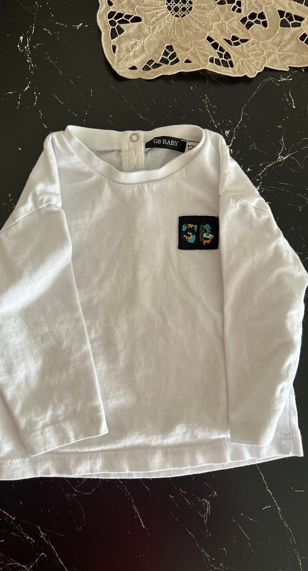 Erkek çocuklar için beyaz pamuklu uzun kollu tişört, yuvarlak yaka ve küçük baskılı detaylı. Arkasında cırt cırtlı kapanış bulunur, bol kesimdir.