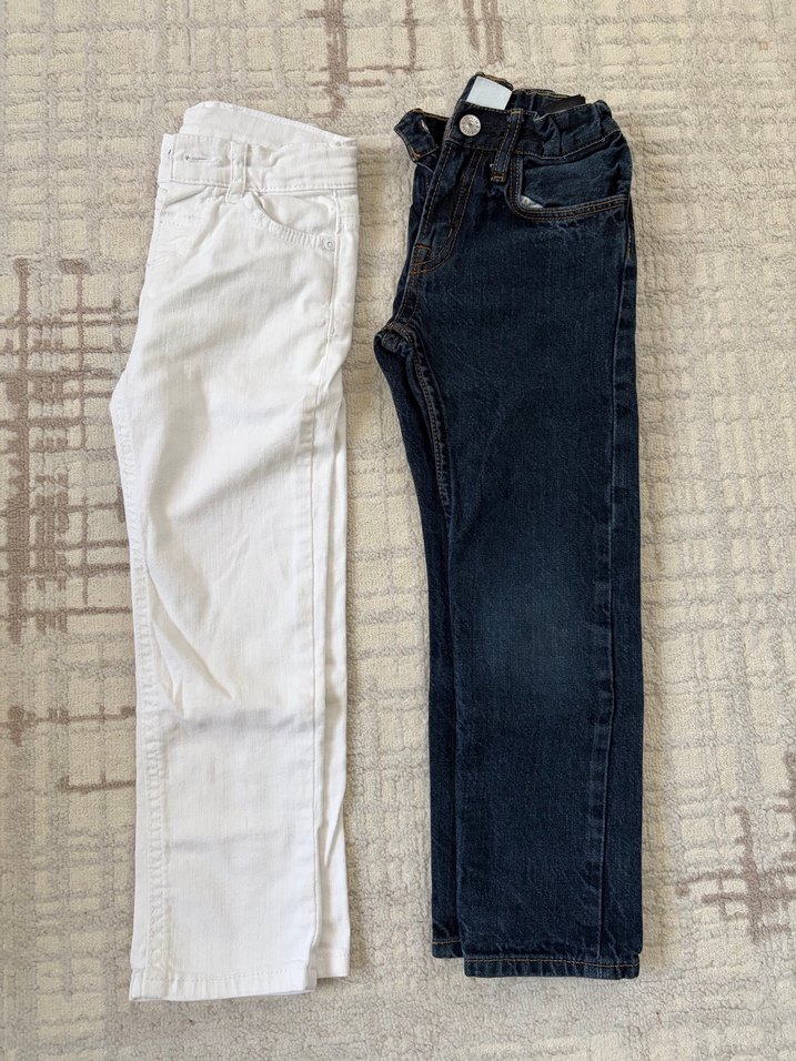 Erkek çocuklar için beyaz ve lacivert renkte, dar kesim kot pantolonlar. Düz ve normcore tarzda, tokalı bel detayı vardır. Günlük kullanıma uygundur. İkili fiyatıdır