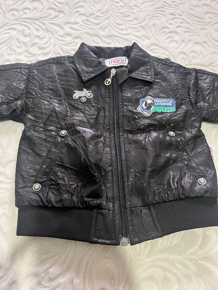 Siyah deri, düğmeli ve işlemeli yamalarla süslü erkek çocuk biker ceketi, trend ve rahat bir görünüme sahiptir. ️