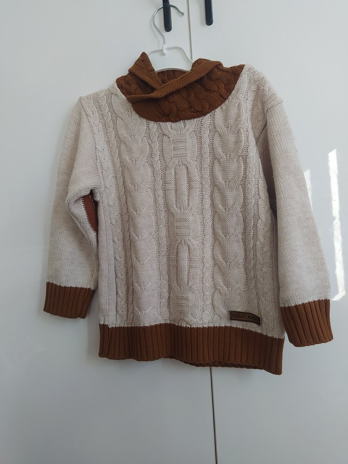 Boğazlı ve uzun kollu, örgü erkek çocuk kazak. Kahverengi ve gri tonlarıyla, rahat kesim ve trend sokak stili için uygundur. +bere