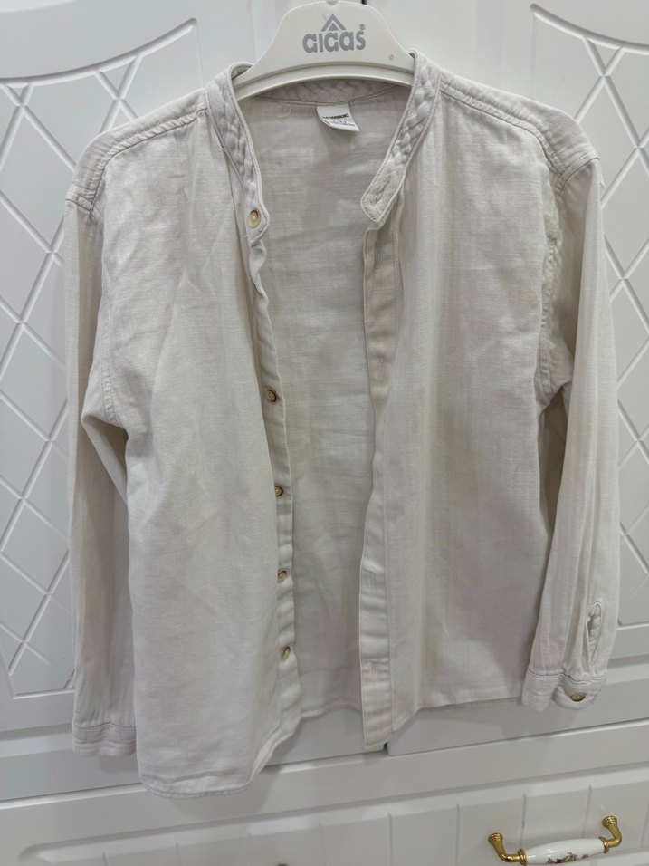 Erkek çocuk keten gömlek, uzun kollu ve yakalıdır. Düğmeli, bol kesim, düz ve desensiz gri renkte bohem tarzda.