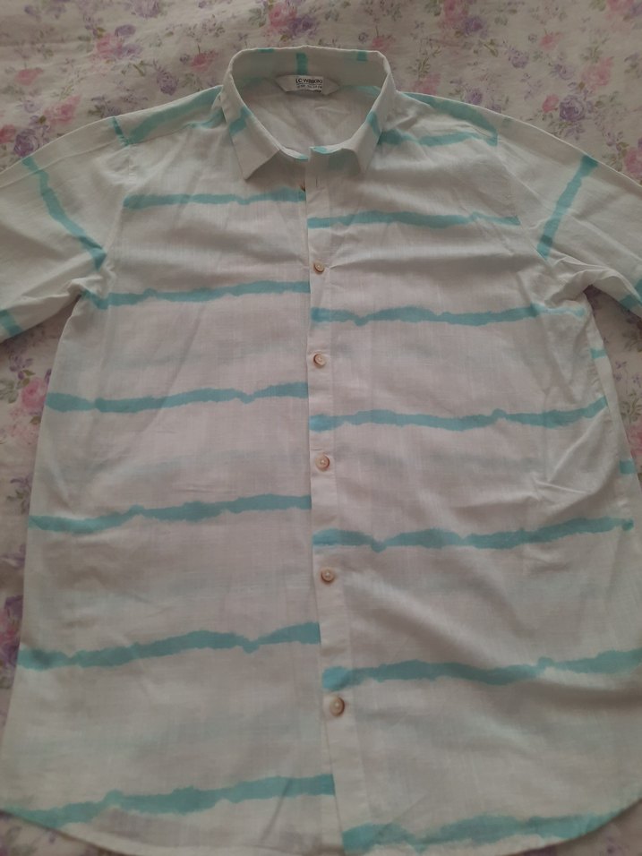 Erkek çocuk için keten kumaştan, bol kesim, yakalı ve kısa kollu gömlek. Pastel tonlarda batik desenli ve düğmeli, bohem tarzda.