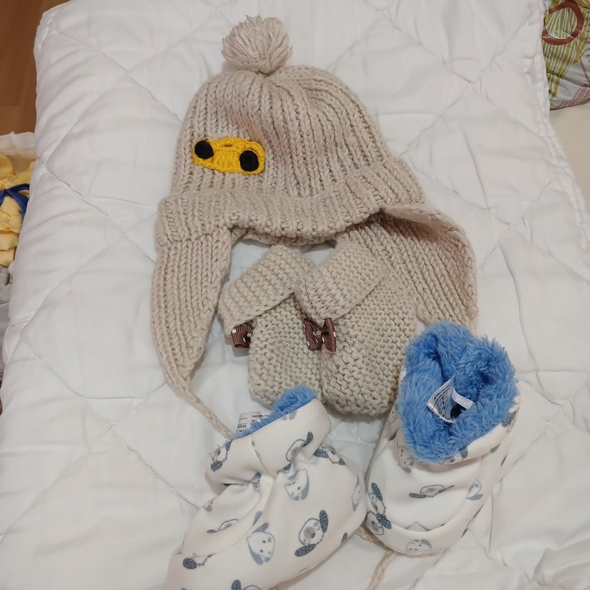 Kulaklıklı, ponponlu örgü erkek çocuk bere, uyumlu yumuşak astarlı patiklerle tamamlanmış. Nötr tonlarda sade tasarım. ❄️
