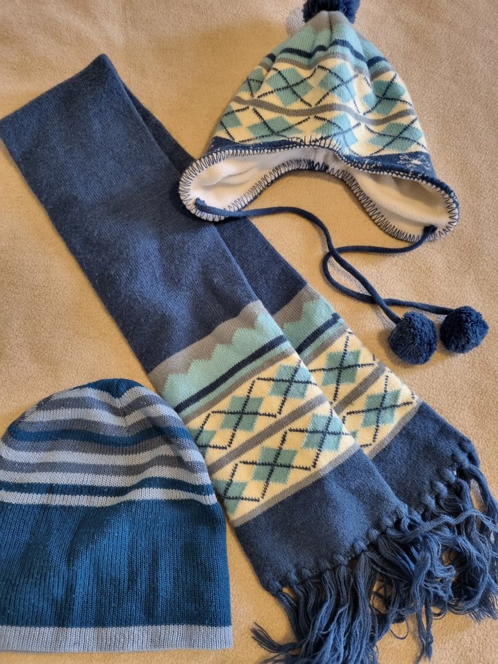 Erkek çocuk için örgü, bohem tarzda mavi tonlarında kulaklıklı ponponlu bere, çizgili bere ve püsküllü atkı seti.