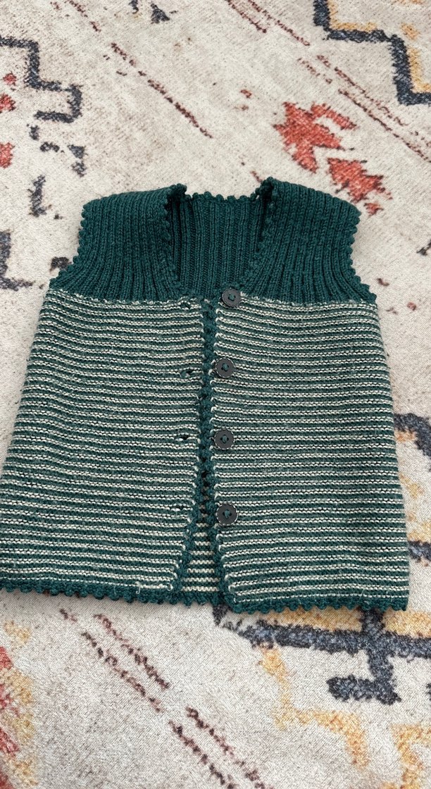 Bu erkek çocuk yeleği, bohem tarzda, kollu olmayan ve yakalıdır. Gri ve koyu yeşil renklerde, düz örme kumaştan üretilmiştir.