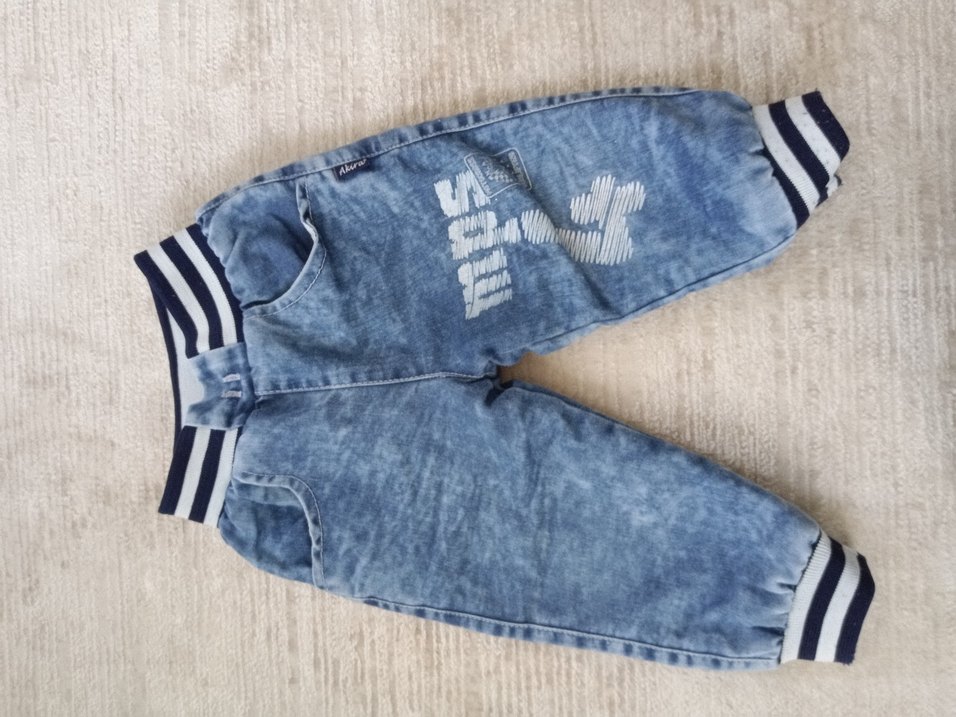 Gri renkli, düğmeli ve bol kesim erkek çocuk denim pantolon. Sokak tarzı ve baskılı detaylara sahip. İçi polarlı