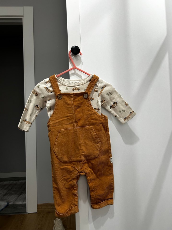 Erkek çocuklar için bol kesim, kahverengi pamuk tulum. Uzun kollu, tokalı askılı ve gri deseniz uzun kollu tişörtle birlikte. Sol bacağında dikiş atması var fotoğraflarda gözüküyoe