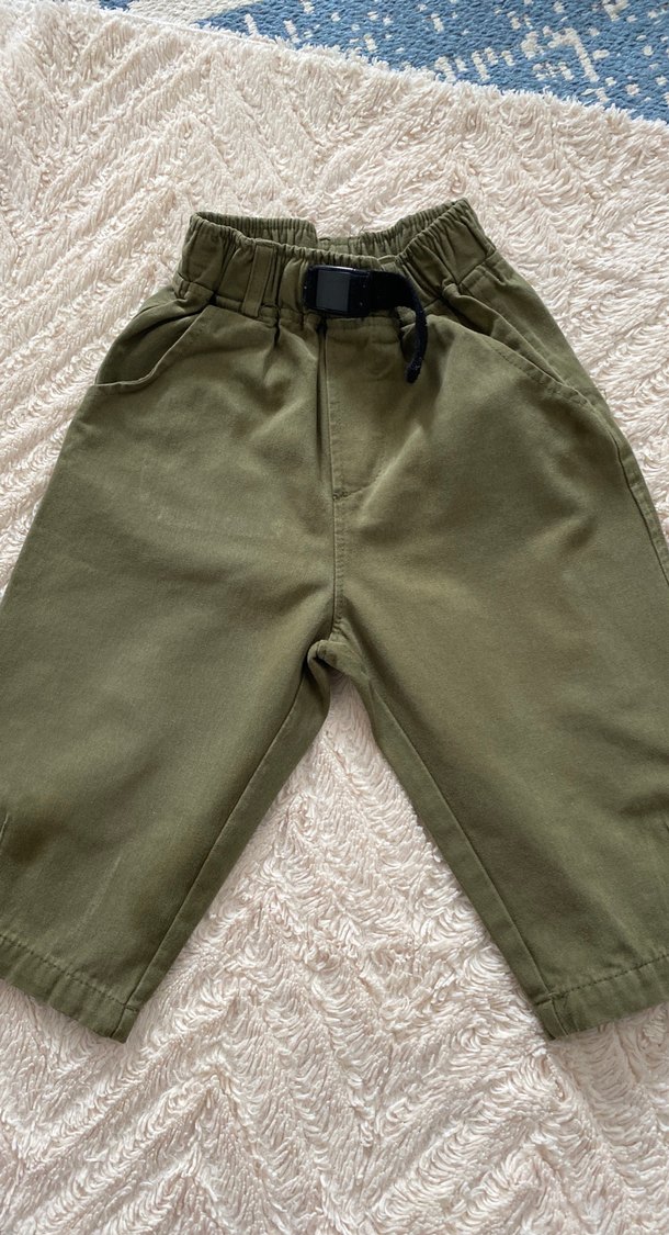 Pamuk kumaştan yapılmış, kemerli ve bol kesim erkek çocuk pantolonu. Düz tasarıma sahip, yeşil-gri renkte rahat bir model. Hiç bir sorunu yok