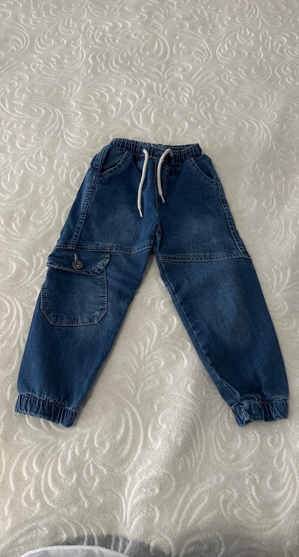 Erkek çocuklar için bol kesim kot pantolon, kemerli ve büyük yan cepli. Rahat sokak stili için elastik paça detaylı.