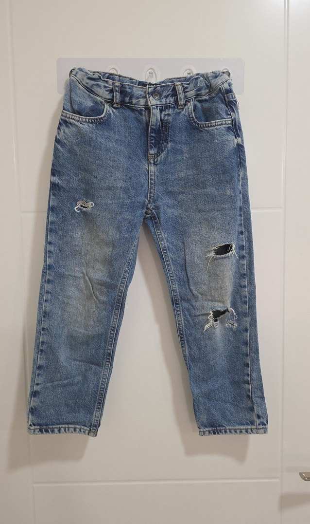 Bol kesim, tokalı erkek çocuk kot pantolonu, sokak stilinde yırtık detaylarla mavi-gri tonlarında.