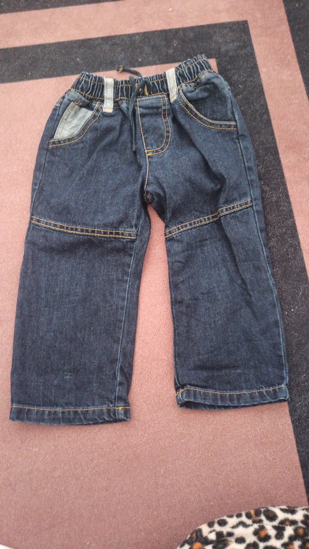 Erkek çocuklar için bol kesim mavi kot pantolon, kemerli ve elastik bel detaylı. Günlük kullanıma uygun sade ve rahat tarzda.
