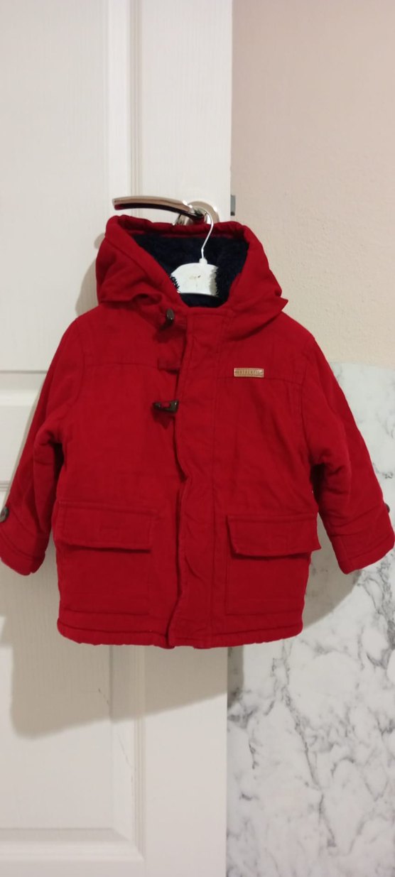 Düğmeli, yakalı ve kırmızı renkte, yumuşak ve sıcak kumaştan yapılmış erkek çocuk montu. Sokak stili için uygun, düz ve sade tasarıma sahiptir. içi yünlü unisex rengi bordo ışıktan kırmızı çıktı