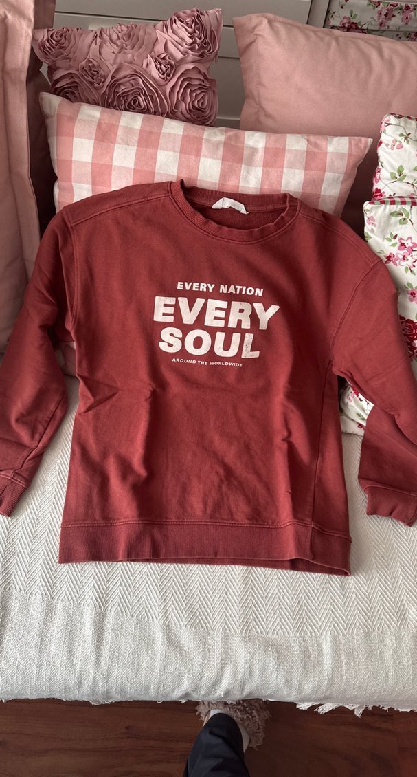 Bordo renkli pamuklu sweatshirt, uzun kollu ve salaş kesimdir. Önünde "EVERY NATION EVERY SOUL" baskısı bulunur, rahat ve şık sokak stili için uygundur.