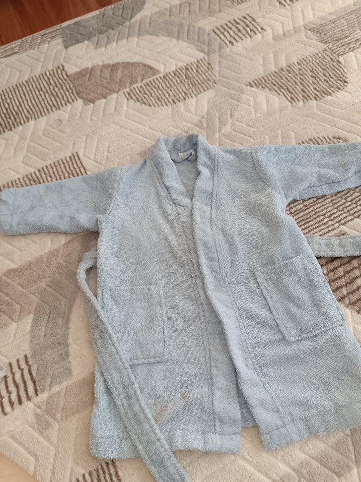 mavi renk, yumuşak ve emici kumaştan yapılmış, kemerli ve iki ön cepli erkek çocuk bornozu.