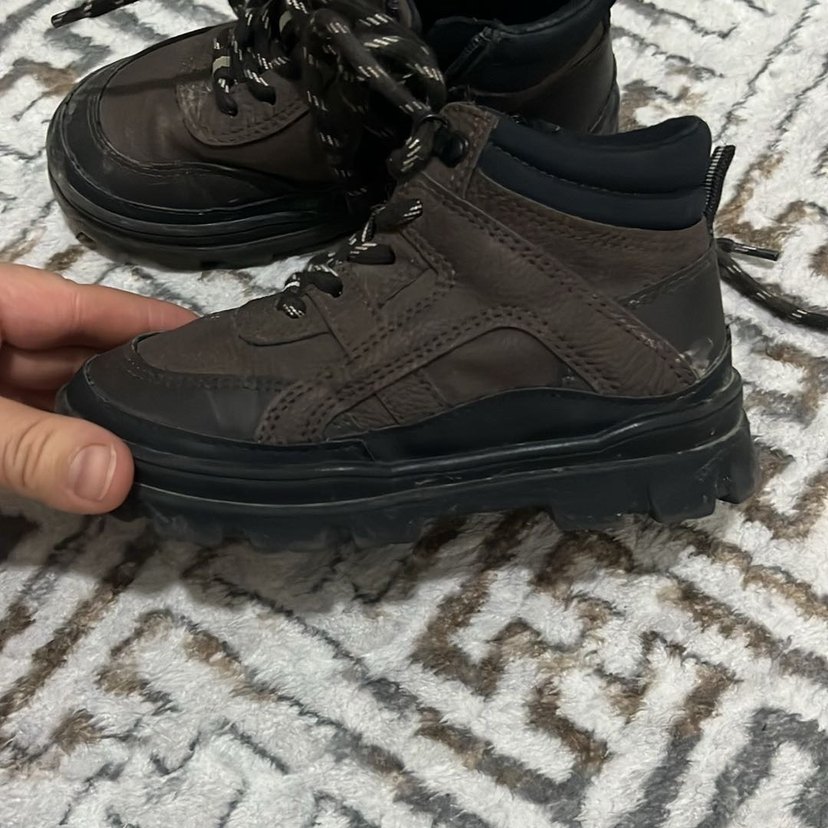Kahverengi-siyah renkli kauçuk tabanlı erkek çocuk botu. Sokak stiline uygun rahat ve şık bir model.