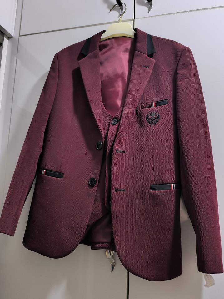 Bordo renkli, düğmeli ve normal kesim erkek takım elbisesi. Notch yaka ve uzun kollu, klasik ve iş ortamına uygun şık tasarım. ✨ tam kalıptır hiç bir sorunu yoktur ceket ve yelekten oluşmaktadır