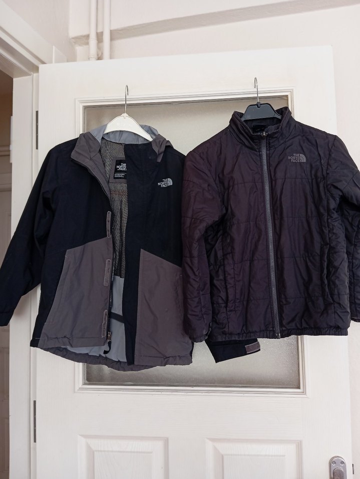 The North Face marka gri ve siyah erkek çocuk çift mont, uzun kollu ve yüksek yakalı, dar kesim, midi boyda, cırt cırtlı kapamalı outdoor ve sokak stili için uygundur.