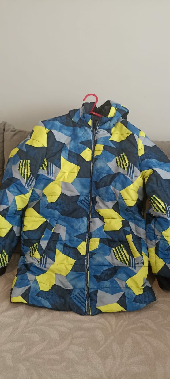 9 10 yaş Erkek çocuklar için dar kesim, fermuarlı ve yakası kesimli mont. Sentetik kumaştan, mavi, gri ve sarı renkli tie-dye desenli, şık street wear tarzında.