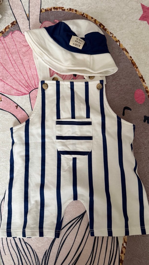 Beyaz üzerine lacivert dikey çizgili, ön cepli ve fırfırlı askılı, fit kesim tulum. Şapka ile birlikte.