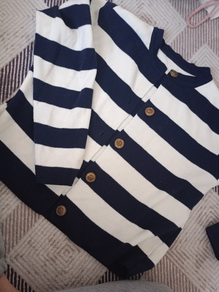 düğmeli ve bol kesim pamuklu hırka. Lacivert ve beyaz çizgili, sokak stili için uygundur.