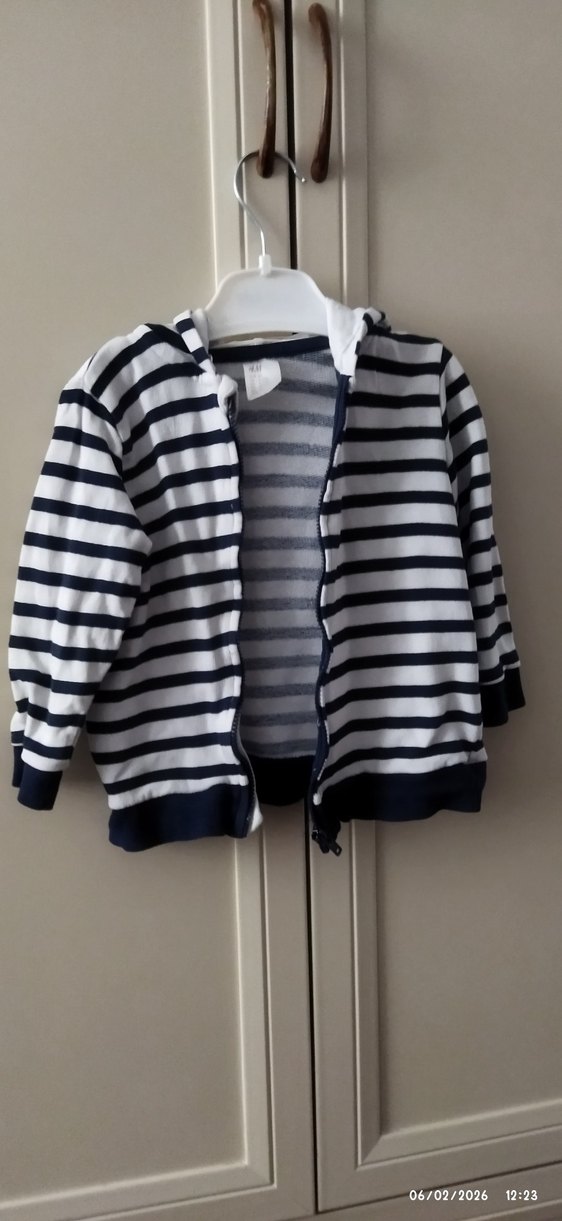 Bu dar kesim erkek çocuk hırka, uzun kollu ve fermuarlı kapamalıdır. Gri ve beyaz çizgili desene sahip, yumuşak ve sıcak kumaştan üretilmiştir.