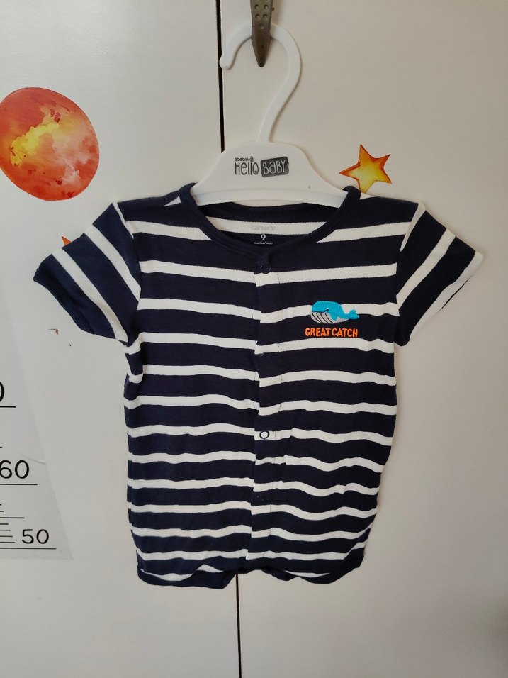 Erkek çocuklar için kısa kollu, yakalı ve düğmeli ön kısmı olan pamuklu, çizgili ve küçük balina baskılı dar kesim tulum