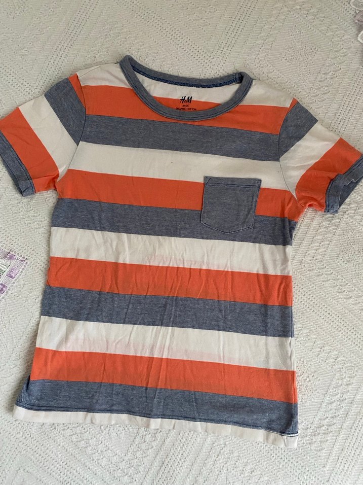 1 kez anca kullanıldı tertemiz 6 - 8 yaş erkek çocukları için uygundur Pamuk kumaştan yapılmış, kısa kollu, bisiklet yaka ve çizgili desenli erkek çocuk tişörtü. Göğüs cebine sahip rahat kullanışlı