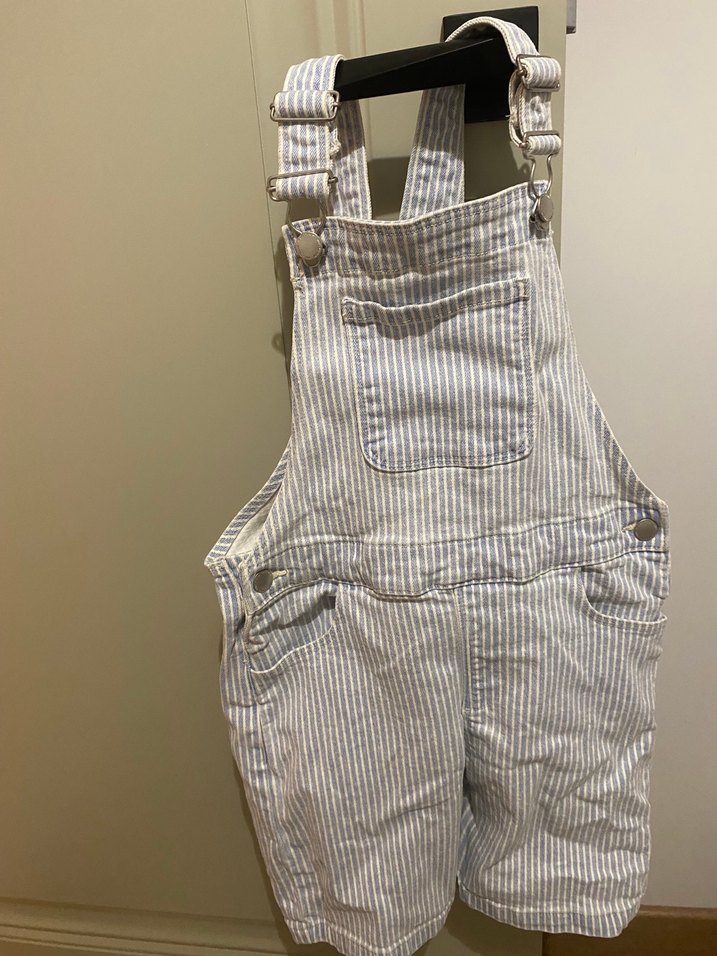 çizgili desenli, kot kumaştan yapılmış çocuk salopet. Ayarlanabilir tokalı askıları ve dar kesimi ile sokak modasına uygun. Temiz durumdadır 4-5yas bedeni mango marka