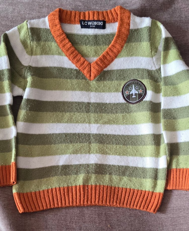 Uzun kollu, V yaka erkek çocuk çizgili örgü kazak. Yeşil ve beyaz çizgili, turuncu kenar detaylı, rahat kesim.