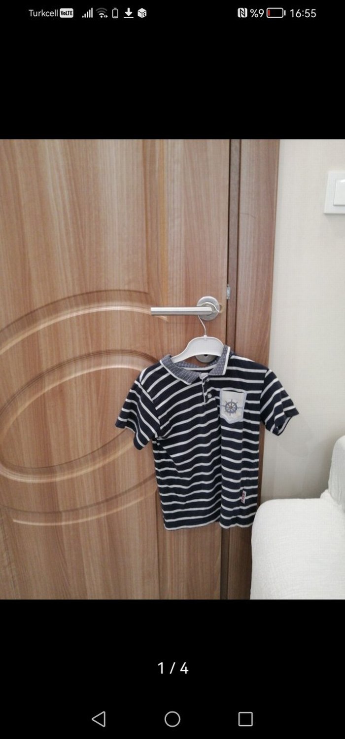 Pamuklu kumaştan, kısa kollu, düğmeli ve yakalı, çizgili baskılı erkek çocuk gömleği.
