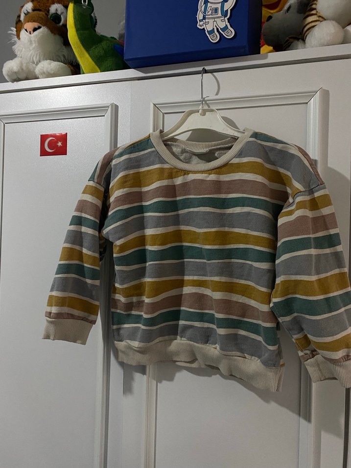 Erkek çocuklar için bol kesim, uzun kollu, yuvarlak yakalı, örme dokulu ve çok renkli çizgili keten kumaştan sweatshirt. Sokak stili için uygundur.