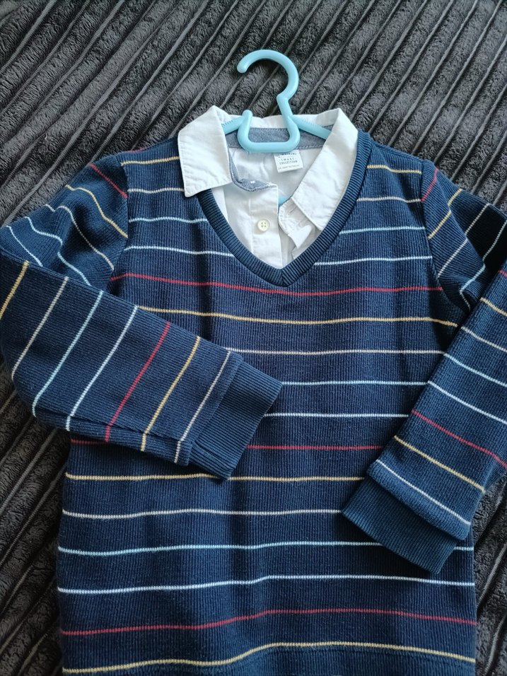 Erkek çocuk için yakalı, uzun kollu ve bol kesim çizgili triko yün kazak. Mavi renkte, rahat ve sıcak tutan dokuma kumaştan üretilmiştir.
