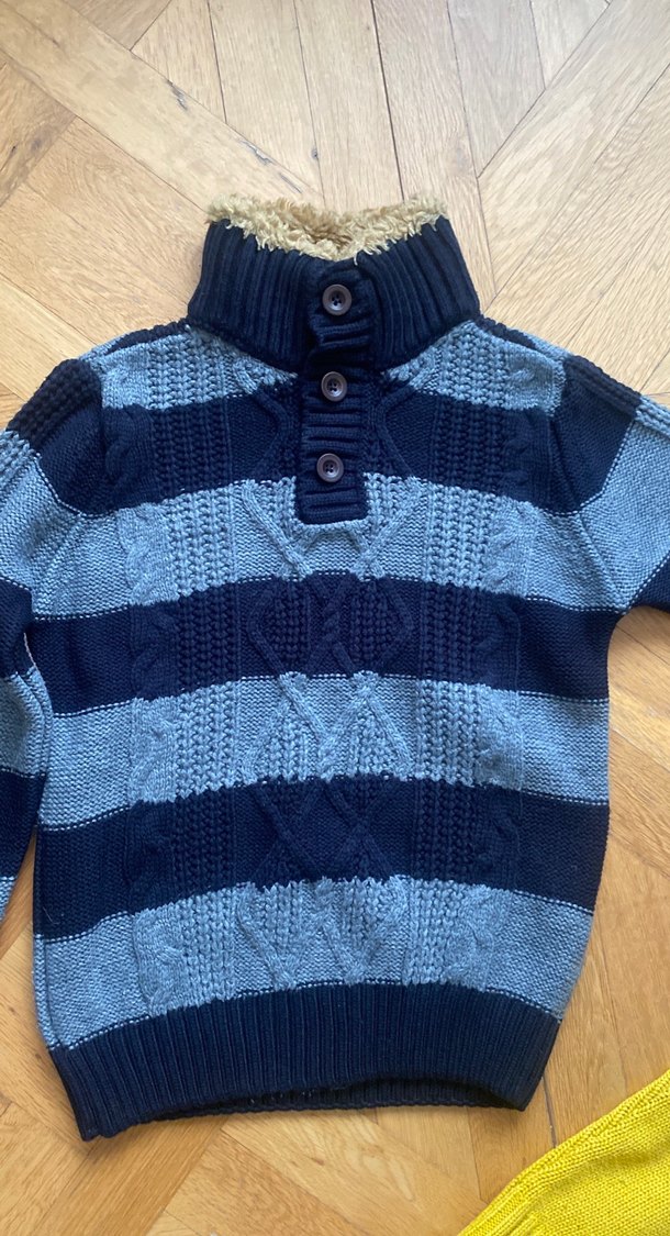 Erkek çocuk için mavi ve gri çizgili, düğmeli yakalı ve uzun kollu, triko örgü kazak. Rahat ve sıcak dokusu ile gündelik kullanıma uygun.