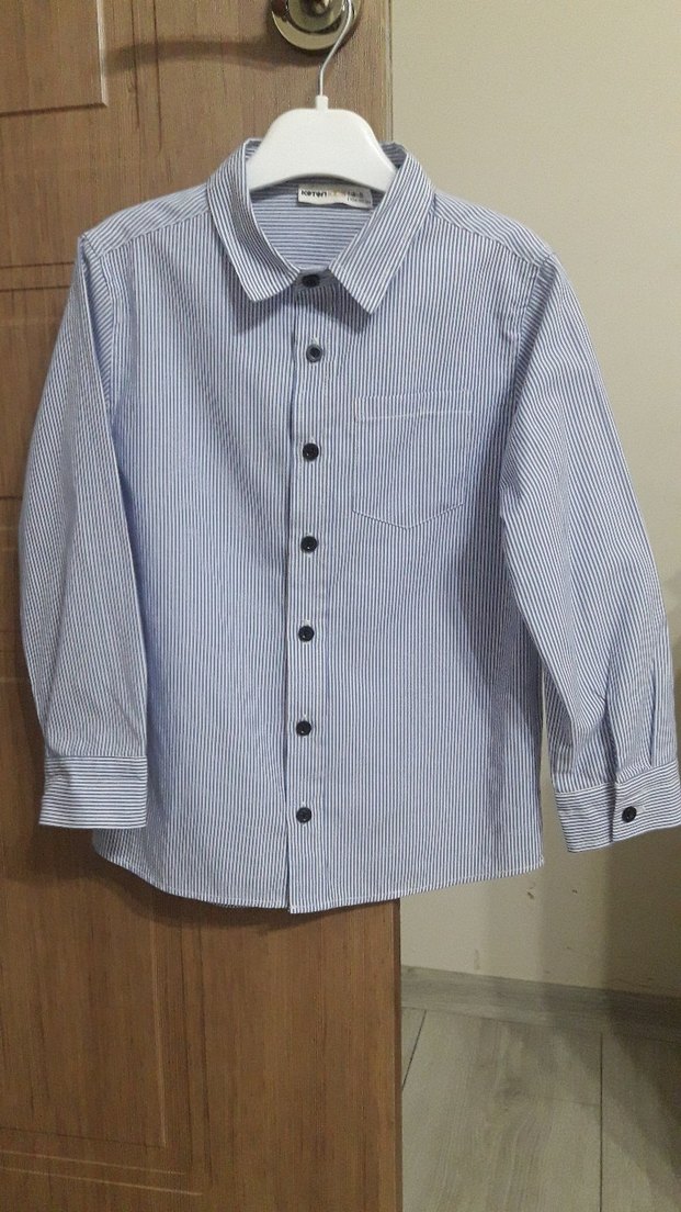 Mavi ve beyaz çizgili, uzun kollu, düğmeli, yakası kesimli ve regular fit pamuk erkek çocuk gömleği. Trendy casual tarzına uygundur.