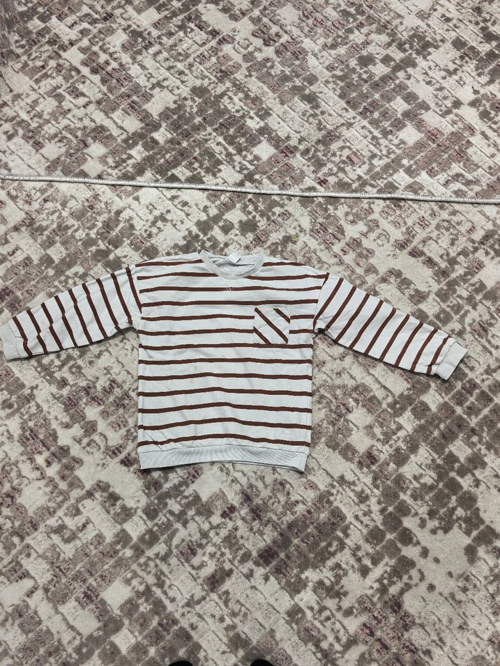 Erkek çocuklar için uzun kollu, salaş kesim sweatshirt. Kahverengi çizgiler ve göğüs cebine sahip, yumuşak ve sıcak kumaştan üretilmiştir.