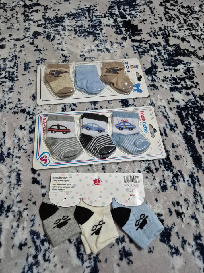 Gri, mavi ve bej tonlarında, araba ve roket baskılı çok renkli erkek çocuk çorap seti.