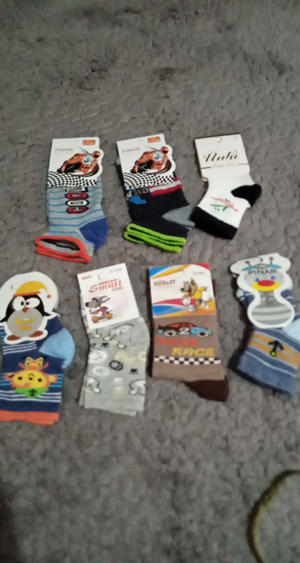 Erkek çocuklar için çok renkli baskılı desenlere sahip çorap seti, gri tonlar da dahil. Eğlenceli ve renkli tasarımlar içerir. 0-1-3-4-5-6 yaş için