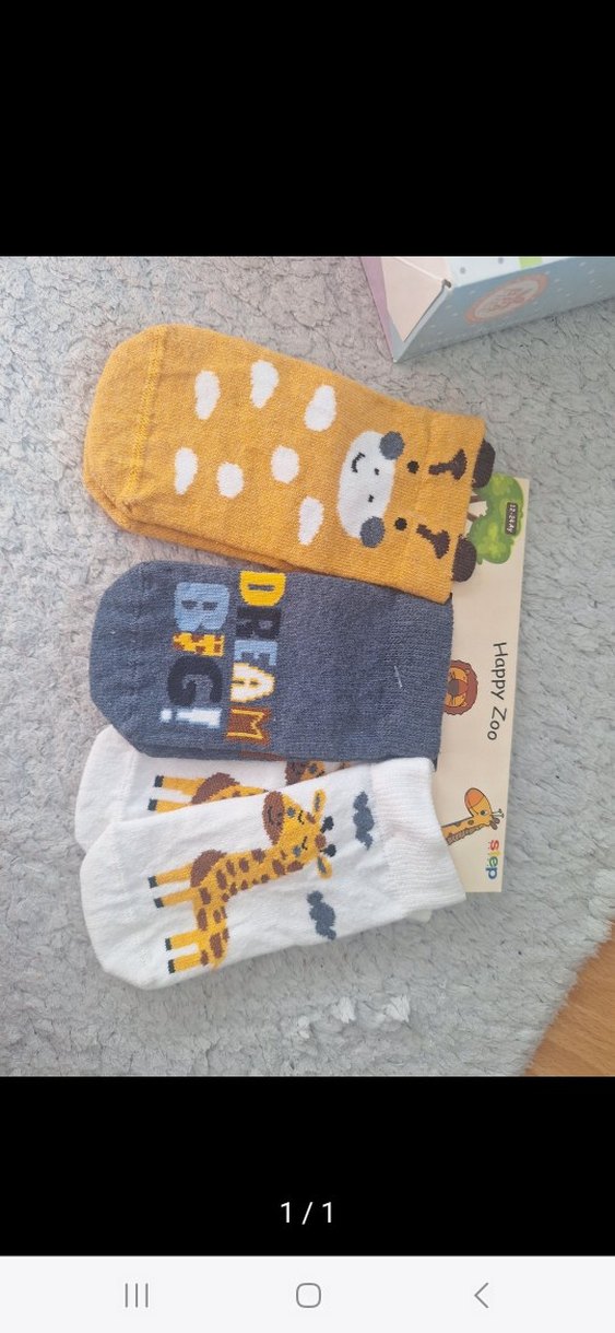 Çok renkli ve baskılı üç çift erkek çocuk çorabı seti. Üzerinde zürafa figürü